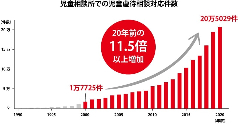 「虐待相談対応件数」は、1990年に統計を開始して以降、一度も減少することなく増加しつづけ、2021年には年間20万件を突破し過去最多を記録しました。核家族化が進み、ひとり親世帯が増加する中で、地域社会から家族が孤立することで養育に困難を抱えている家族が多いことがうかがえます。