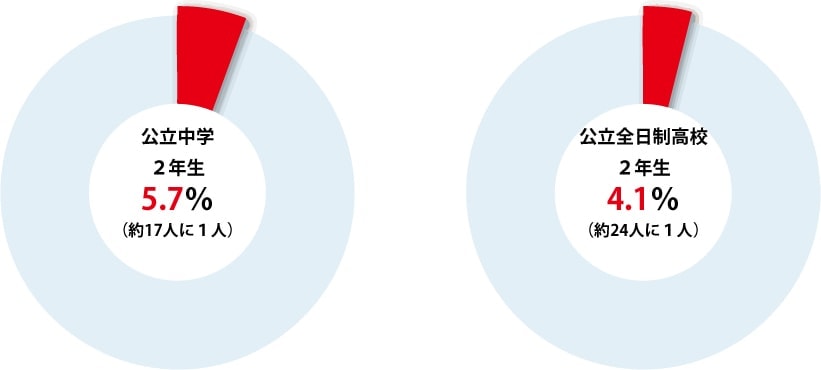 ヤングケアラーとは、本来、大人が担うような家族の介護や世話などを日常的に行っている18歳未満の子ども・若者のことです。公立中学2年生の 5.7%(約17人に1人)公立の全日制高校2年生の4.1%(約24人に1人)が「世話をしている家族がいる」と回答しており、1学級につき1~2人のヤングケアラーが存在している可能性があることが分かっています。